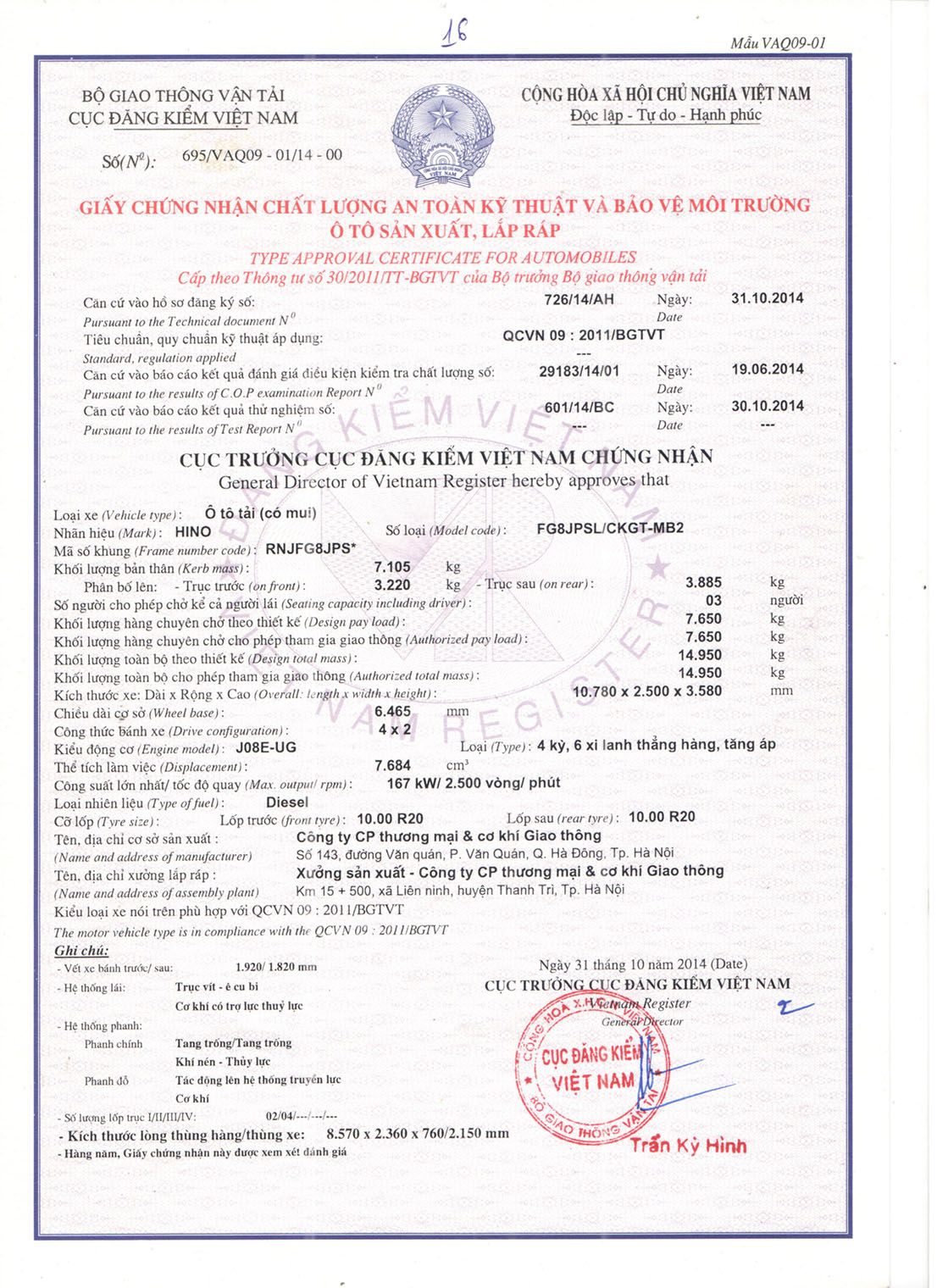 Khối lượng toàn bộ cho phép tham gia giao thông (kg) |