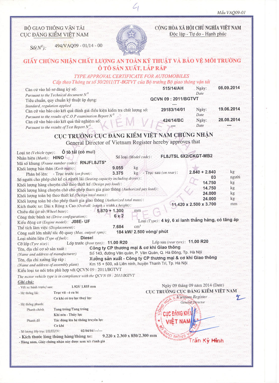 Ô tô tải có mui bạt HINO FL8JTSL 6x2/CKGT-MB2