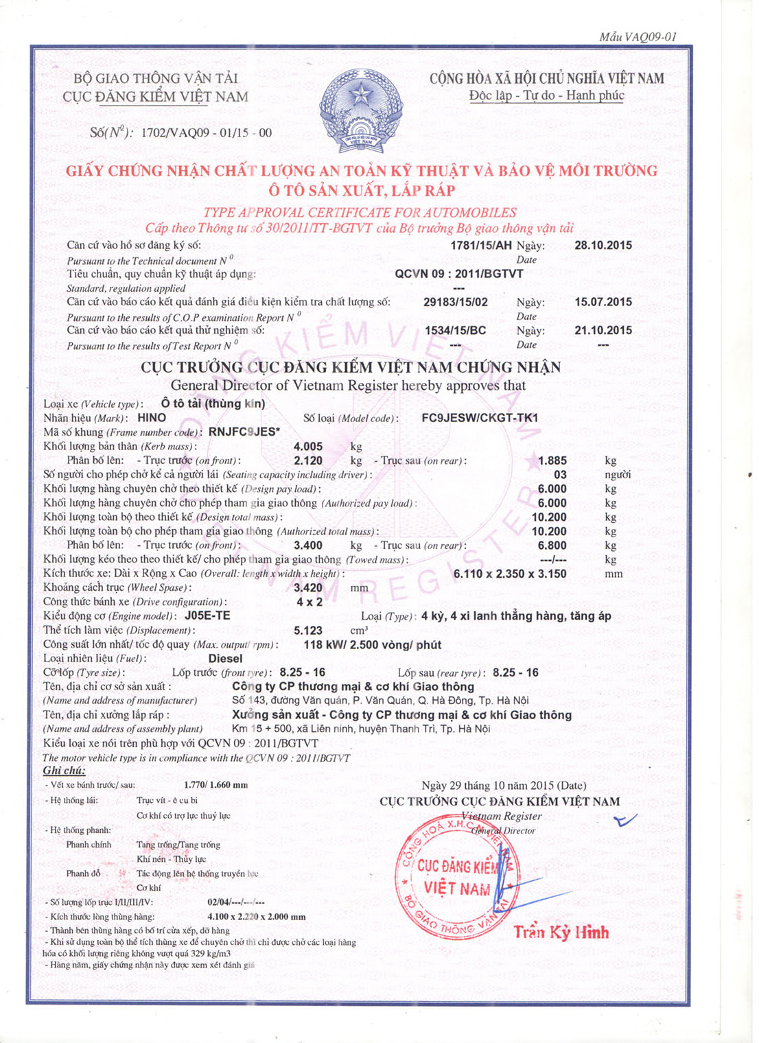 1 Thông tin chung 1.1 Loại phương tiện Ô tô tải (thùng kín) 1.2 Nhãn hiệu, số loại của phương tiện HINO FC9JESW/CKGT-TK1 1.3 Công thức bánh xe 4x2 2 Thông số về kích thước 2.1 Kích thước bao: DxRxC (mm) 6110x2350x3150 2.2 Chiều dài cơ sở (mm) 3420 2.3 Vết bánh xe trước/sau (mm) 1770/1660 2.4 Vết bánh xe sau phía ngoài (mm) 1930 2.5 Chiều dài đầu xe/ đuôi xe (mm) 1145/1545 2.6 Khoảng sáng gầm xe...