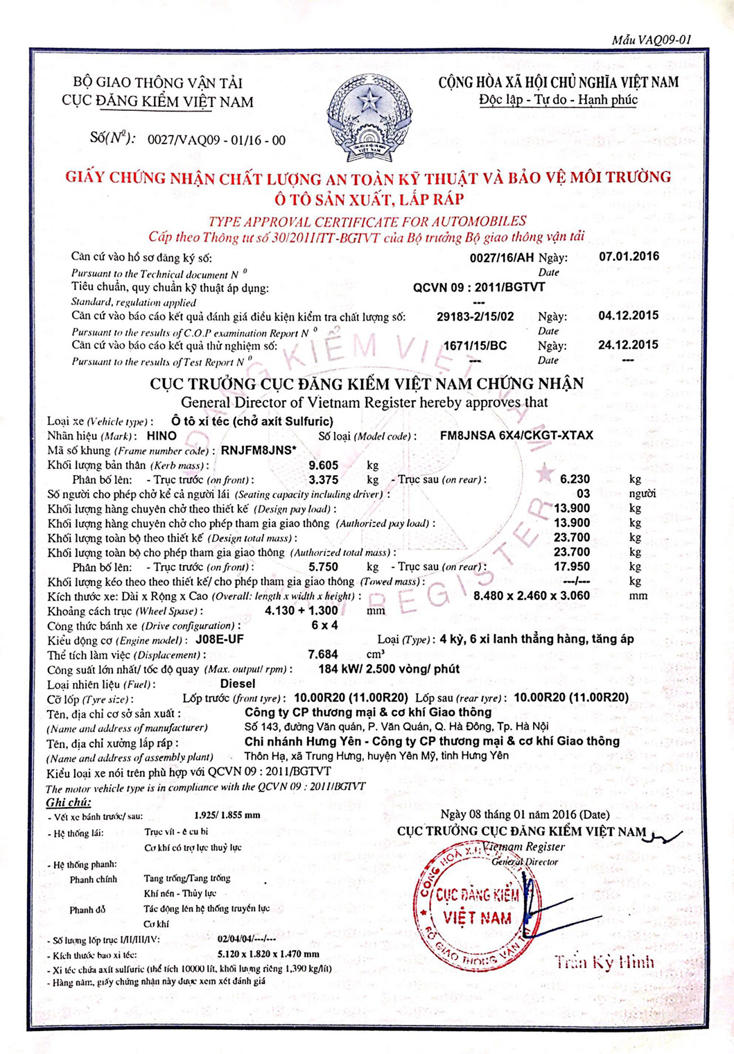 Ô tô xi téc chở axit sulfuric HINO FM8JNSA 6x4/ CKGT- XTAX an toàn tuyệt đối, chất lượng đảm bảo,...