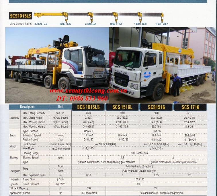 Đặc tính kĩ thuật cơ bản Đơn vị SCS 1015LS Tính năng Sức nâng cho phép Kg 10000 Mômen nâng max Tấn.m 36,0 Chiều cao nâng tối đa m 23(27) Bán kính làm việc m 20,7(24,9) Chiều cao làm việc m 24,5(28,5) Công suất nâng/ Tầm với Kg/ m 10000/3,0 6.000/5,6 3.100/9,4 1.950/13,1 1.400/16,9 1.030/20,7 Cơ cấu cần Loại/ Số đốt Hexa/5 Tốc độ duỗi cần m/ giây 15,1/ 40 Tốc độ nâng Độ/ giây 0 - 81/ 20 Tời nâng Tốc độ dây cáp m/ phút Thấp :...