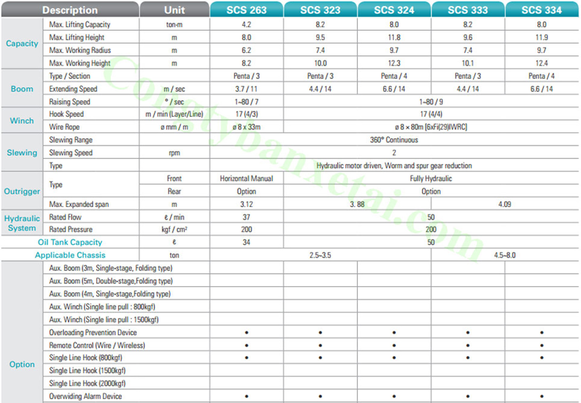 THÔNG SỐ KĨ THUẬT ĐƠN VỊ SCS334 TÍNH NĂNG Sức năng cho phép kg 3200 Mô men nâng tối đa kg.m 8000 Chiều cao nâng tối đa m 11,9 Bán kính làm việc m 9,7 Chiều cao làm việc m 12,4 Công suất nâng/ Tầm với kg/ m 3200/ 2,6 2340/ 3,1 1350/ 5,3 800/ 7,5 600/ 9,7 CƠ CẤU CẦN Loại/ Số đốt Penta/ 4 Tốc độ duỗi cần m/s 6,6/ 14 Tốc độ nâng cần Độ/s 1-80/ 9 CƠ CẤU TỜI Tốc độ dây...