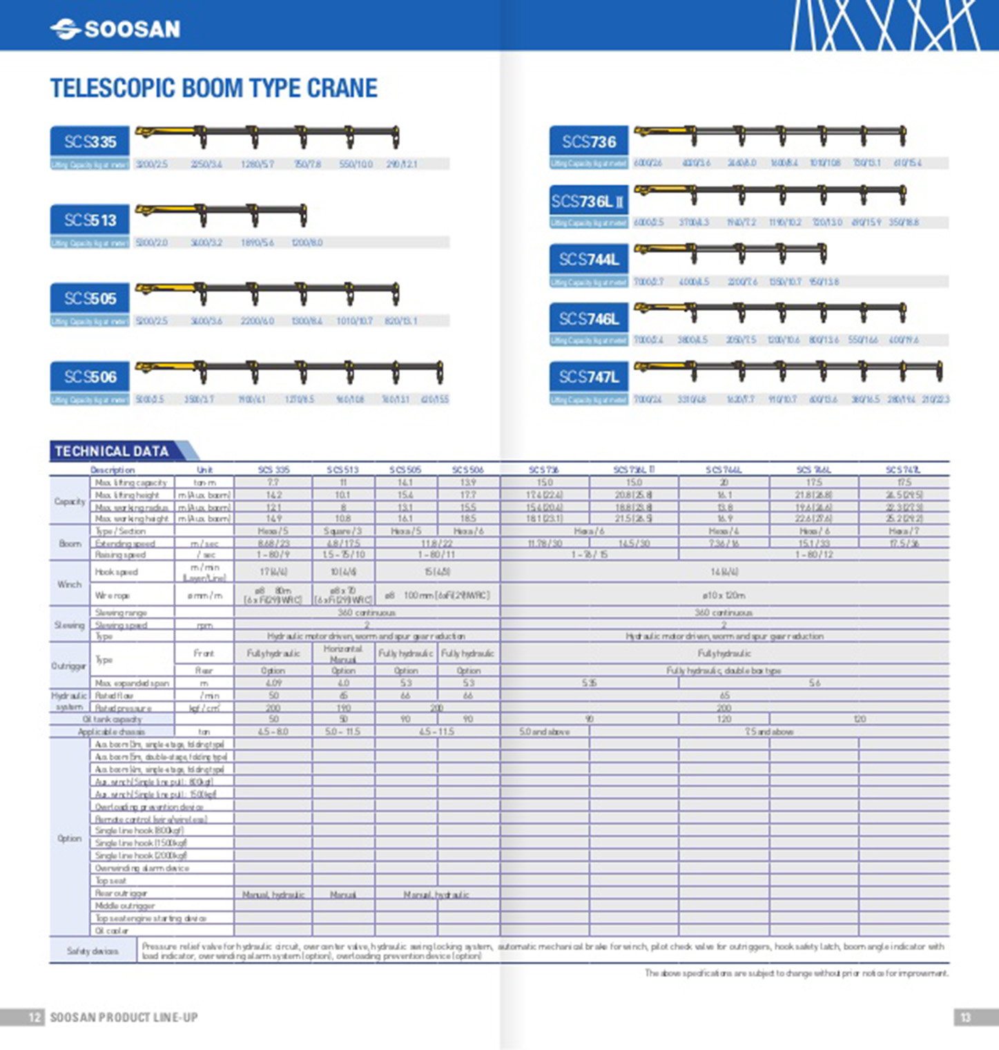 THÔNG SỐ KĨ THUẬT ĐƠN VỊ SCS513 TÍNH NĂNG Sức năng cho phép kg 5500 Mô men nâng tối đa kg.m 11000 Chiều cao nâng tối đa m 10,1 Bán kính làm việc m 8,0 Chiều cao làm việc m 10,8 Công suất nâng/ Tầm với kg/ m 5500/ 2,0 3400/ 3,2 1890/ 5,6 1200/ 8,0 CƠ CẤU CẦN Loại/ Số đốt Penta/ 3 Tốc độ duỗi cần m/s 4,8/ 17,5 Tốc độ nâng cần Độ/s 1,5 – 75/ 10 CƠ CẤU TỜI Tốc độ...