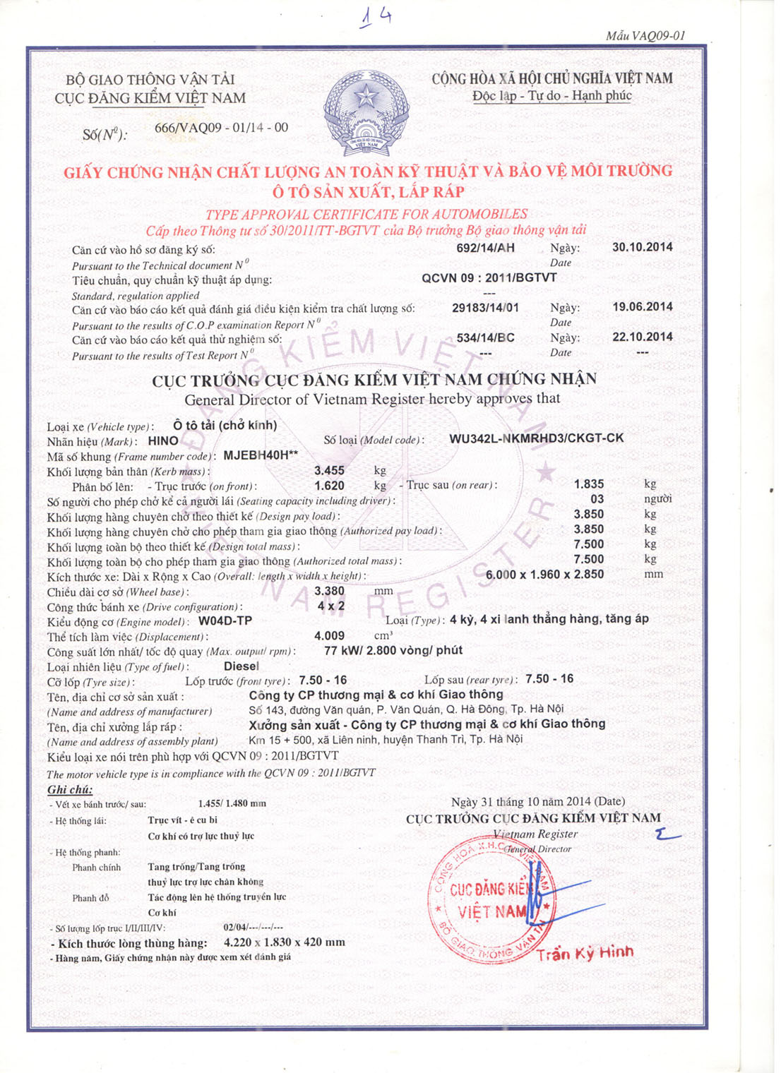 Trục 1: 7.50-16-14PR Trục 2: 7.50-16-14PR |