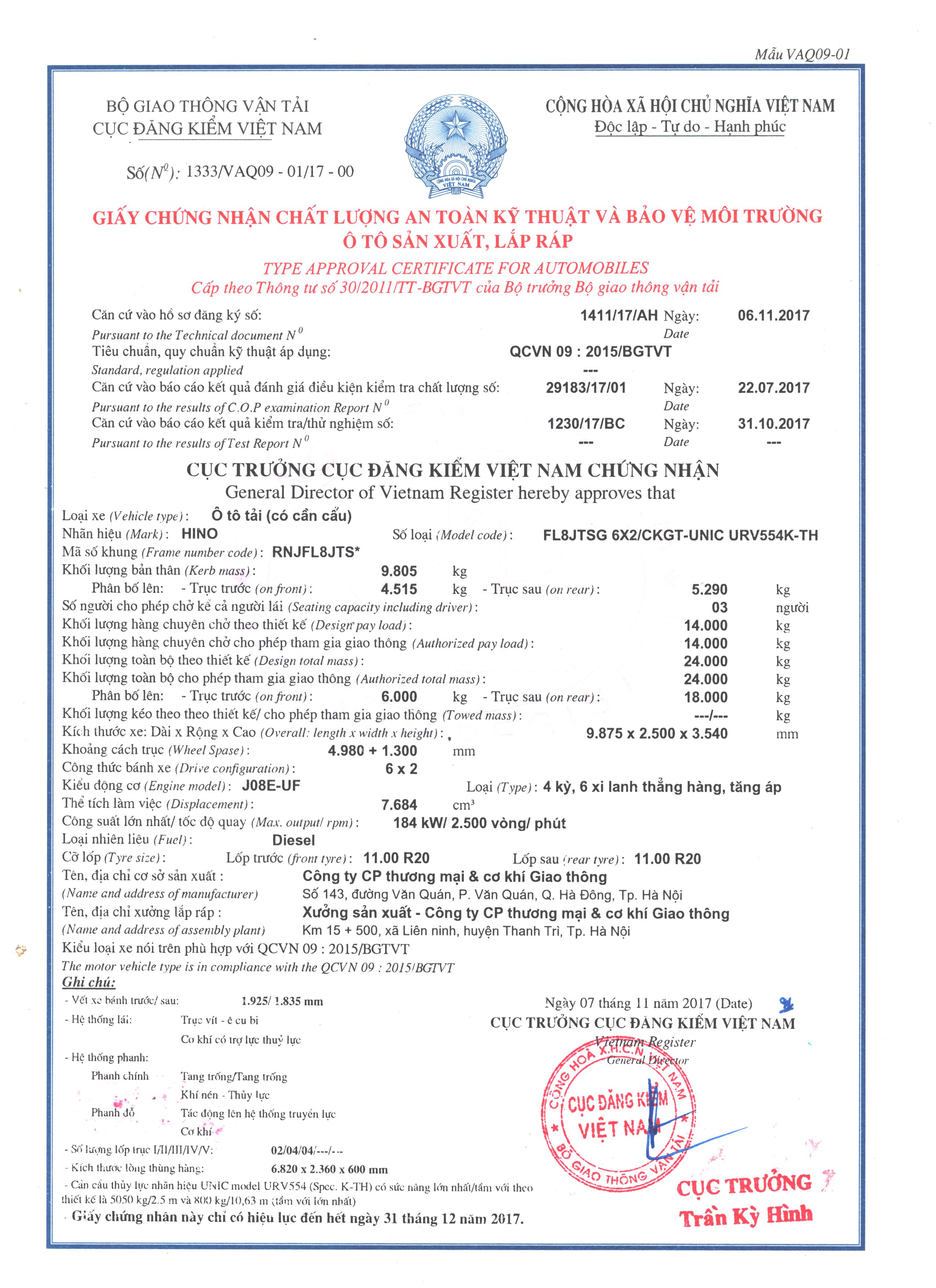 1 Thông tin chung 1.1 Loại phương tiện Ô tô tải (có cần cẩu) 1.2 Nhãn hiệu, số loại của phương tiện HINO FL8JTSG 6x2/CKGT-UNIC URV554K-TH 1.3 Công thức bánh xe 6x2 2 Thông số về kích thước 2.1 Kích thước bao: DxRxC (mm) 9875 x 2500 x 3540 2.2 Chiều dài cơ sở (mm) 4980 + 1300 2.3 Khoảng sáng gầm xe (mm) 2.4 Chiều rộng cabin (mm) 2.5 Chiều rộng thùng...