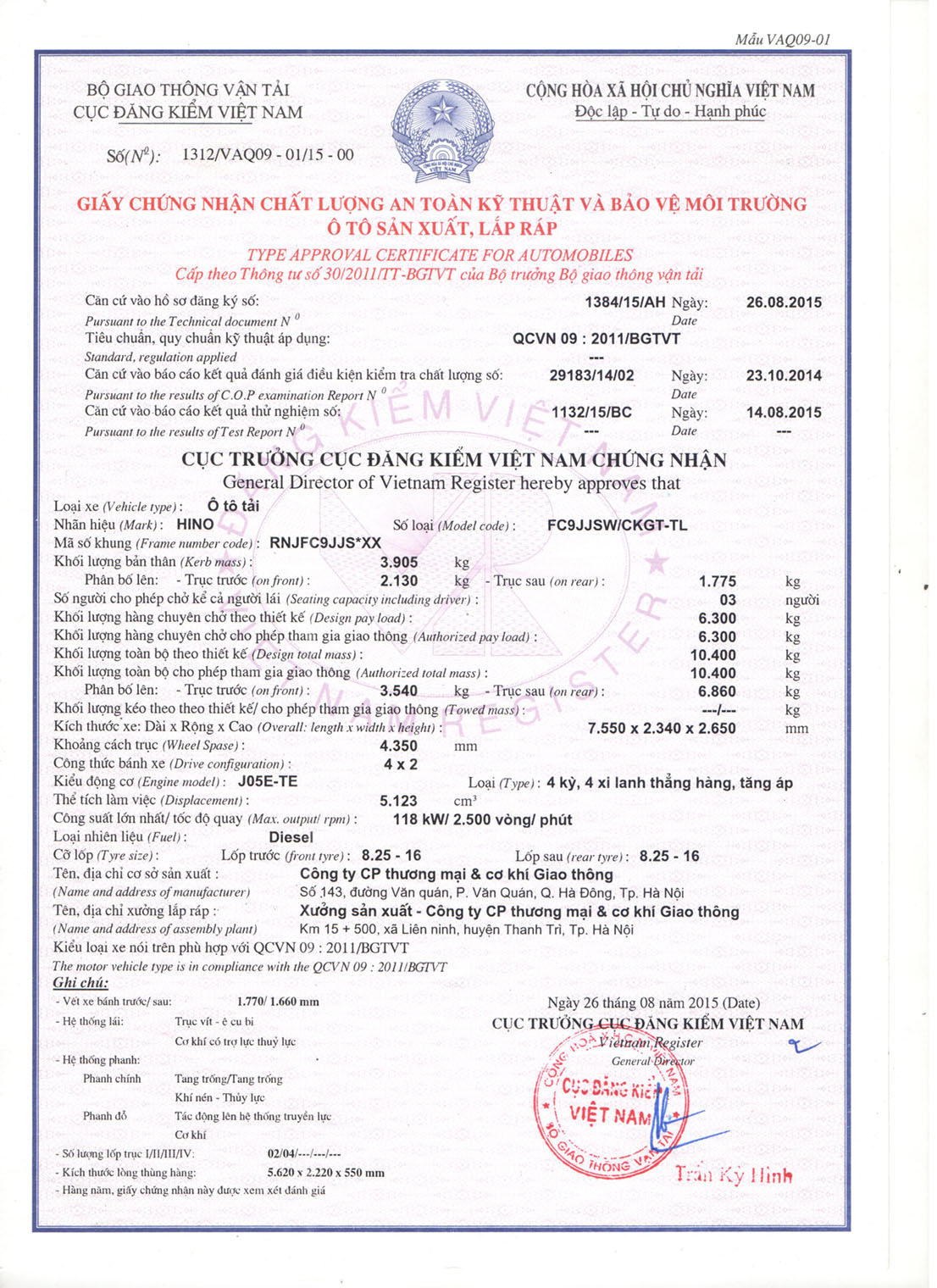 1 Thông tin chung 1.1 Loại phương tiện Ô tô tải 1.2 Nhãn hiệu, số loại của phương tiện HINO FC9JJSW /CKGT-TL 1.3 Công thức bánh xe 4x2 2 Thông số về kích thước 2.1 Kích thước bao: DxRxC (mm) 7550x2340x2650 2.2 Chiều dài cơ sở (mm) 4350 2.3 Vết bánh xe trước/sau (mm) 1770/1660 2.4 Chiều dài đầu xe/ đuôi xe (mm) 1145/2055 2.5 Vệt bánh xe sau phía ngoài (mm) 1930 2.6 Khoảng sáng gầm xe (mm) 225 2.7 Góc...