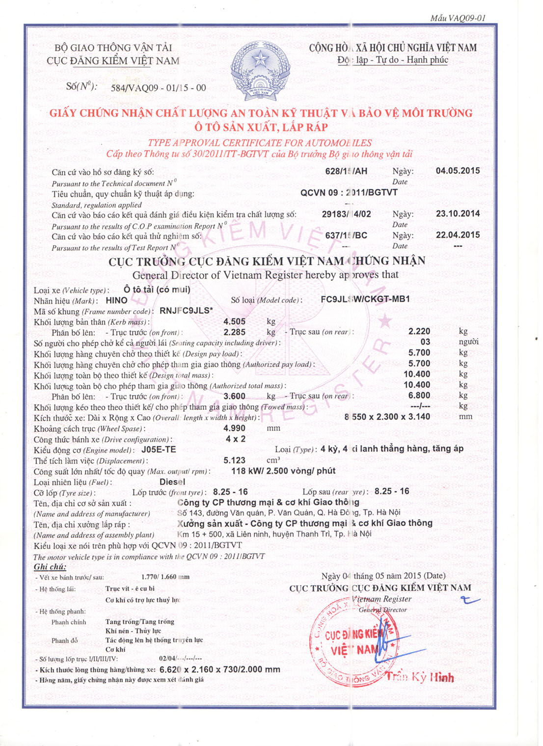 1 THÔNG SỐ KỸ THUẬT 1.1 Loại phương tiện Ô tô tải (có mui) 1.2 Nhãn hiệu, số loại của phương tiện HINO FC9JLSW/CKGT-MB1 1.3 Công thức bánh xe 4X2 2 Thông số về kích thước 2.1 Kích thước bao: DxRxC (mm) 8550x2300x3140 2.2 Chiều dài cơ sở (mm) 4990 2.3 Kích thước lòng thùng (mm) 6620 x 2160 x750/2000 3 Thông số về khối lượng 3.1 Khối lượng bản thân (kg) 4505 3.2 Khối lượng hàng...