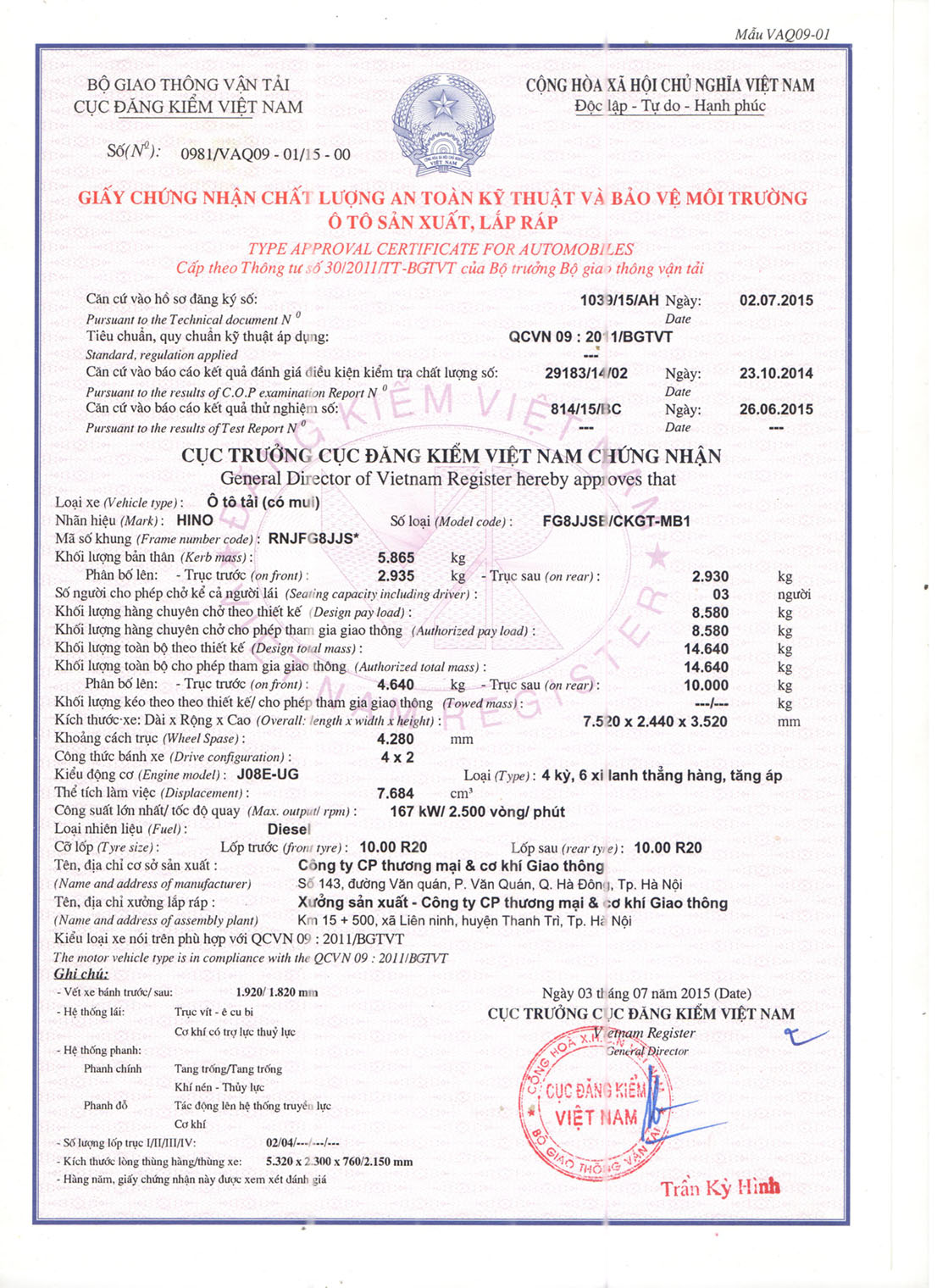 Loại phương tiện Ô tô tải (có mui) HINO FG8JJSB/ CKGT-MB1