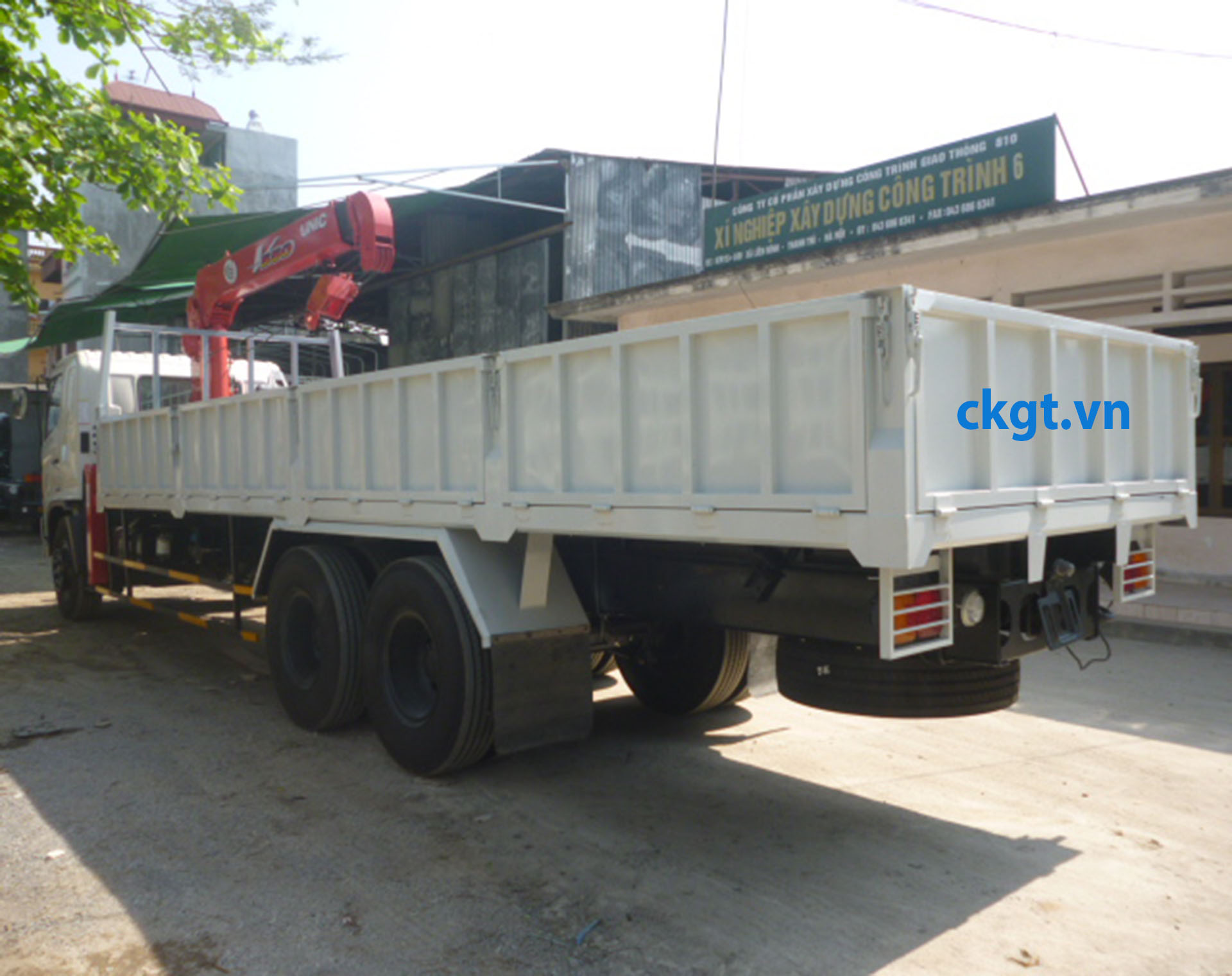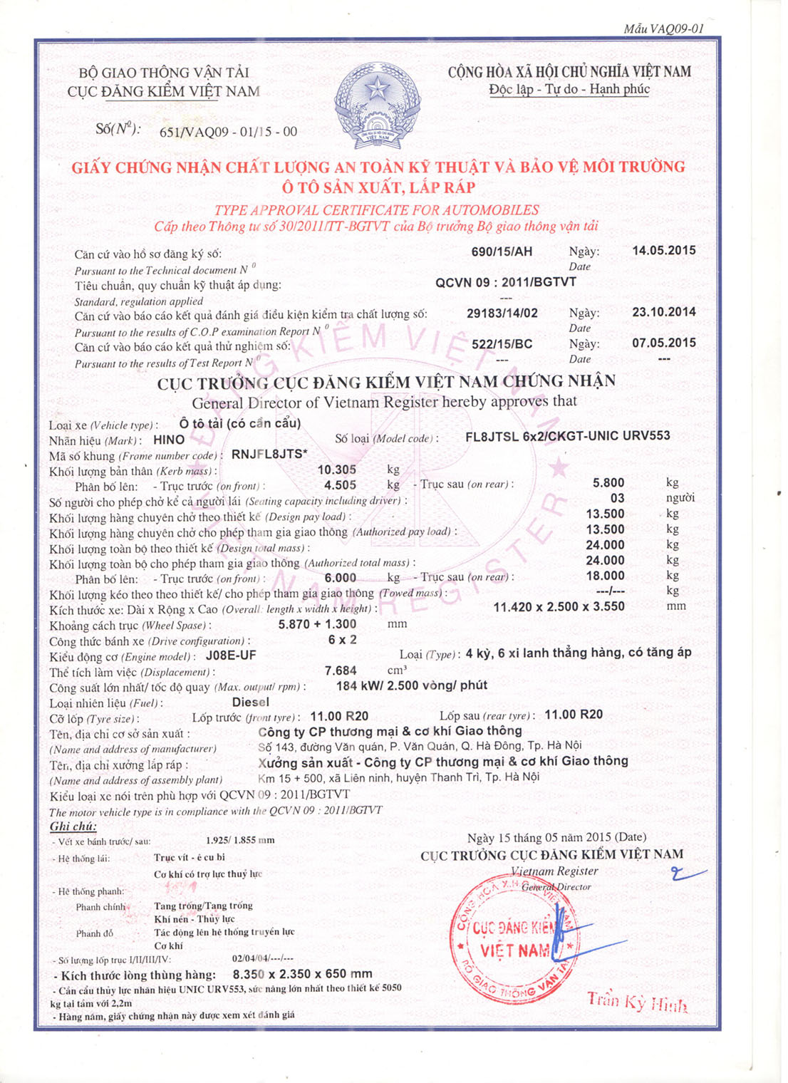 1 Thông tin chung 1.1 Loại phương tiện Ô tô tải (có cần cẩu) 1.2 Nhãn hiệu, số loại của phương tiện HINO FL8JTSL 6X2/ CKGT- UNIC URV553 1.3 Công thức bánh xe 6x2 2 Thông số về kích thước 2.1 Kích thước bao: DxRxC (mm) 11420x2500x3550 2.2 Chiều dài cơ sở (mm) 5870+1300 2.3 Vết bánh xe sau phía ngoài (mm) 2185 2.4 Khoảng sáng gầm xe (mm) 270 2.5 Chiều rộng cabin 2355 2.6 Chiều rộng thùng...