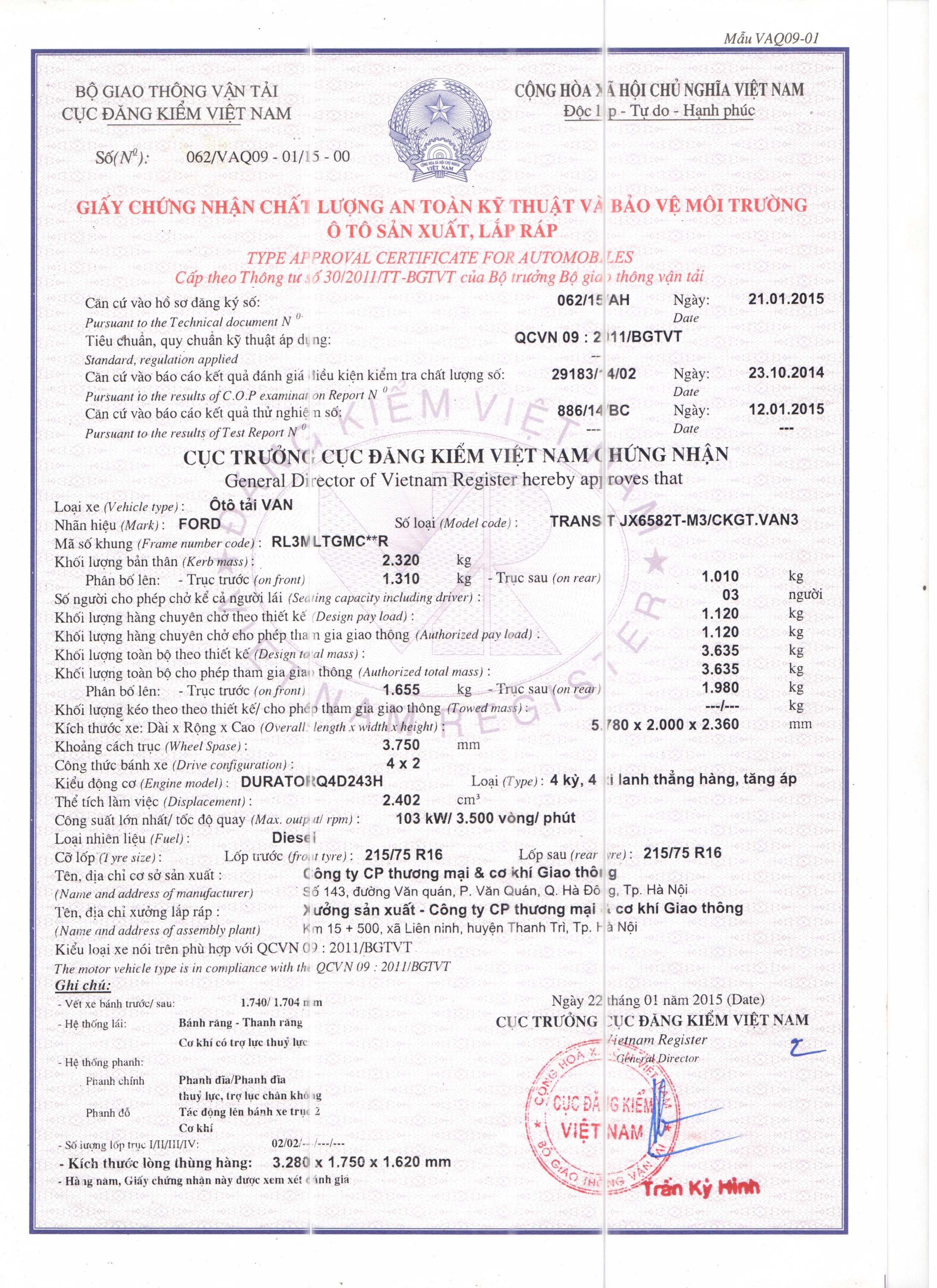 TT THÔNG SỐ TRỊ SỐ 1.1 Loại phương tiện Ô tô tải van 1.2 Nhãn hiệu, số loại của phương tiện FORD TRANSIT JX6582T-M3/CKGT.VAN3 1.3 Công thức bánh xe 4x2 2 Thông số về kích thước 2.1 Kích thước bao : DxRxC (mm) 5780x2000x2360 2.2 Chiều dài cơ sở (mm) 3750 2.3 Vết bánh xe trước/sau (mm) 1740/1704 2.4 Chiều dài đầu xe / đuôi xe (mm) 933/1097 2.5 Khoảng sáng gầm xe (mm) 165 2.6 Góc thoát trước /...