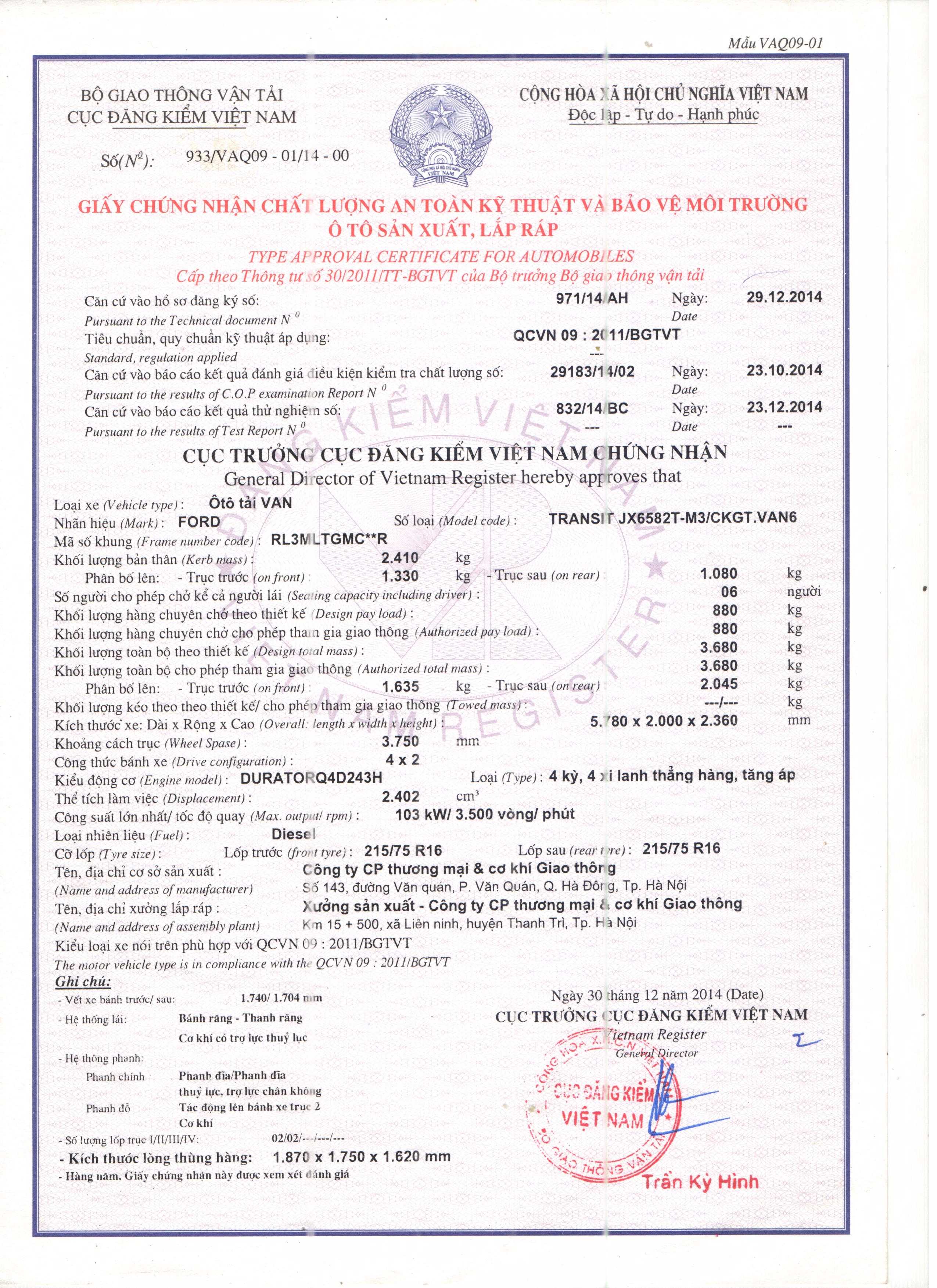 TT THÔNG SỐ Ô TÔ THIẾT KẾ 1.1 Loại phương tiện Ô tô tải van 1.2 Nhãn hiệu, số loại của phương tiện FORD TRANSIT JX6582T-M3/CKGT.VAN6 1.3 Công thức bánh xe 4x2 2 Thông số về kích thước 2.1 Kích thước bao : DxRxC (mm) 5780x2000x2360 2.2 Chiều dài cơ sở (mm) 3750 2.3 Vết bánh xe trước/sau (mm) 1740/1704 2.4 Khoảng sáng gầm xe (mm) 165 2.5 Chiều rộng cabin 2000 3 Thông số về khối lượng 3.1 Khối lượng bản...