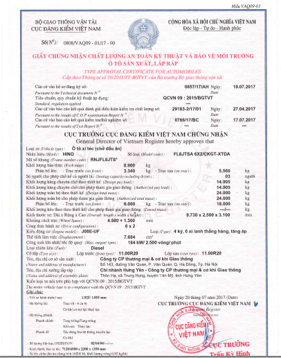 TT Nội dung Thông số 1 Thông tin chung 1.1 Lọai phương tiện Ô tô xi téc chở dầu ăn 1.2 Nhãn hiệu, số loại của phương tiện HINO FL8JTSA 6x2/CKGT-XTDA 1.3 Công thức bánh xe 6x2 2 Thông số về kích thước 2.1 Kích thước bao : Dài x Rộng x Cao (mm) 9730x2500x3100 2.2 Chiều dài cơ sở (mm) 4980+1300 2.3 Kích thước bao xi téc: Dài x Rộng x Cao (mm) 7120/6900x2200x1350 2.4 Dung...