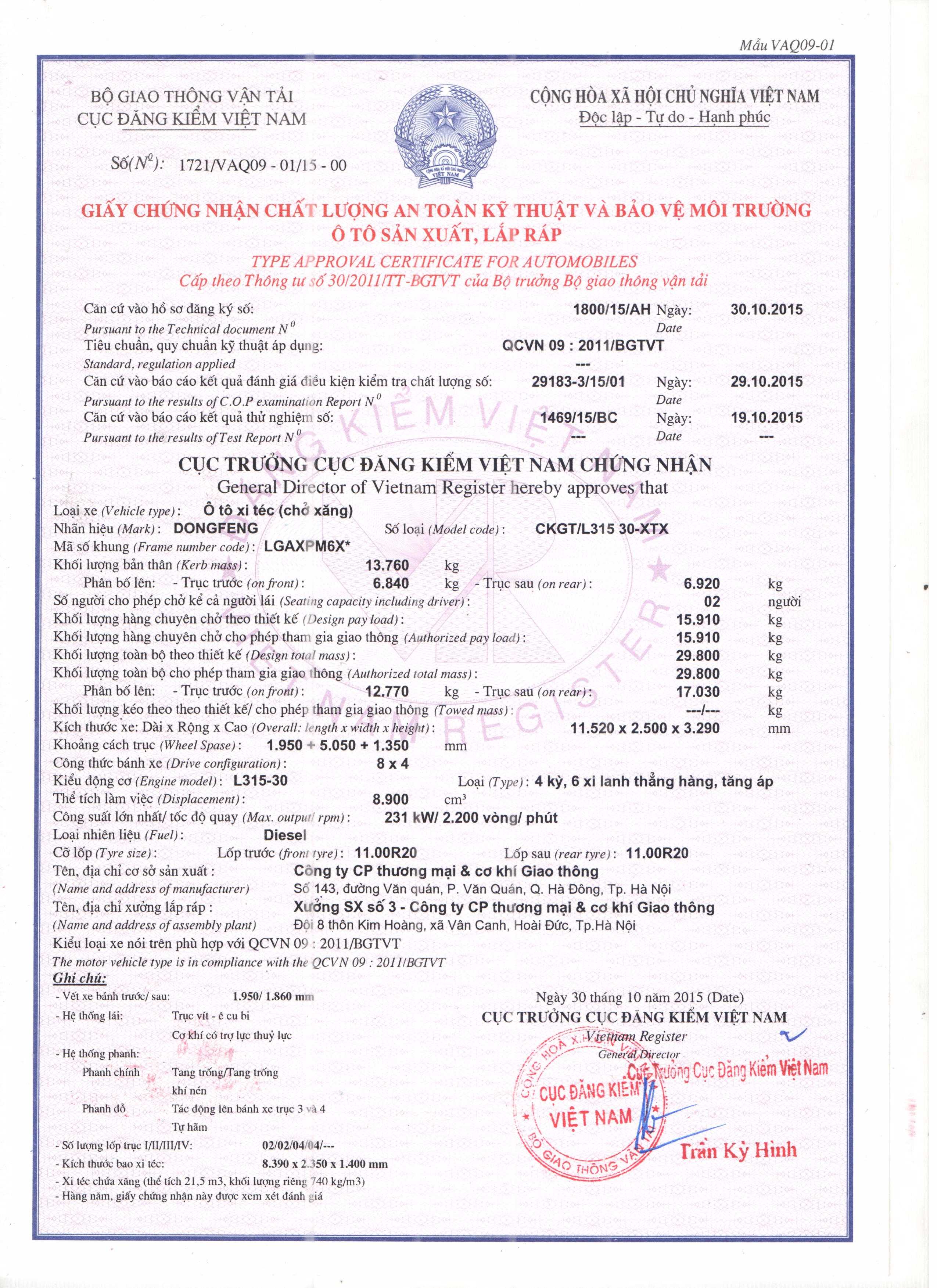 TT Nội dung Trị số 1 Thông tin chung 1.1 Loại phương tiện Ô tô xitéc (chở xăng) 1.2 Nhãn hiệu, số loại của phương tiện DONGFENG L315 30/CKGT-XTX 1.3 Công thức bánh xe 8x4 2 Thông số về kích thước 2.1 Kích thước bao : Dài x Rộng x Cao (mm) 11520x2500x3290 2.2 Chiều dài cơ sở (mm) 1950+5050+1350 3 Thông số về khối lượng 3.1 Khối lượng bản thân (kg) 13760 3.2 Khối lượng hàng chuyên...